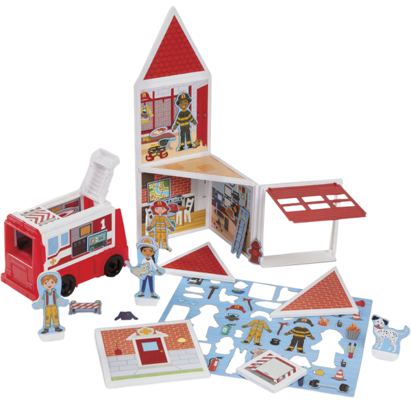 Cele 13 panouri cu două fețe, se atașează figurinele magnetice în combinații diferite, astfel încât copiii să poată construi design-uri noi pentru stația de pompieri și motorul de pompieri de fiecare dată când se joacă.