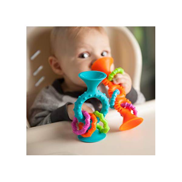 Interesul senzorial al acestei creații cu aspirație, este irezistibil! Texturile vii inspira degetele pentru a apuca, in timp ce siliconul moale relaxeaza gingiile inflamate.