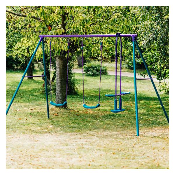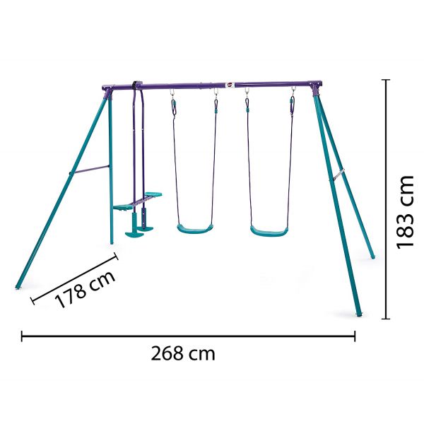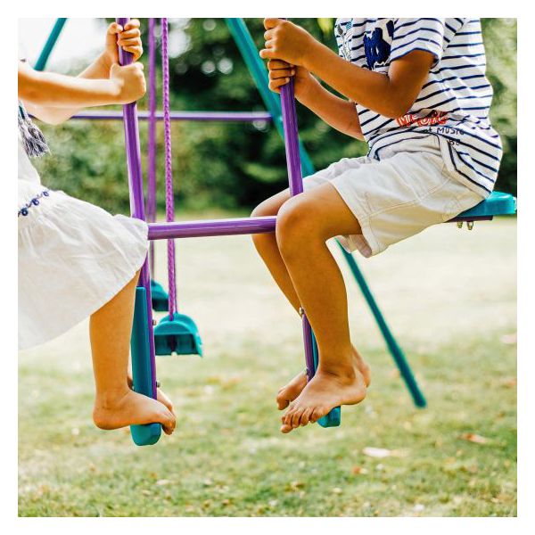 Leagan metalic pentru 4 copii. Confectionat din otel anticoroziv, perfect pentru a ajuta copiii să exerseze și să-și dezvolte echilibrul si coordonarea. Ideal pentru joaca și exercițiu în aer liber. Leagane din plastic turnat prin injecție, reglabile pe inaltime si funie moale pentru confortul mainilor.