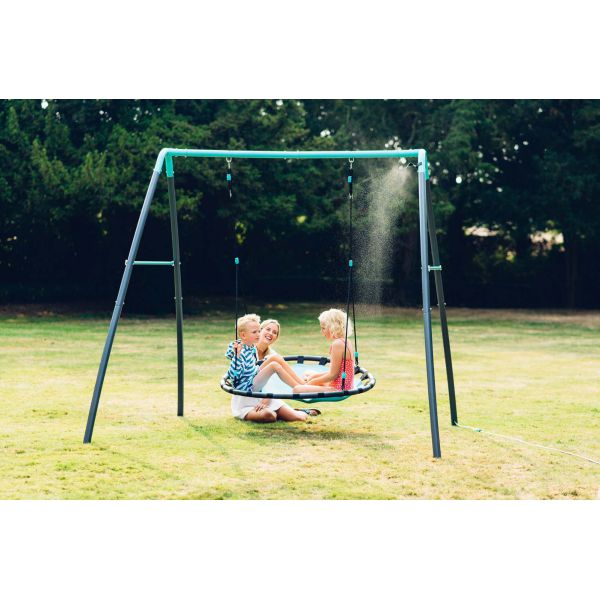 Leagan metalic premium tip cuib,pentru 2 copii. Confectionat din otel anticoroziv, perfect pentru a ajuta copiii să exerseze și să-și dezvolte echilibrul si coordonarea. Ideal pentru joaca și exercițiu în aer liber. Leagane din plastic turnat prin injecție, reglabile pe inaltime si funie moale pentru confortul mainilor.