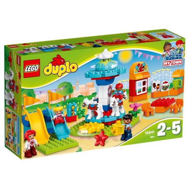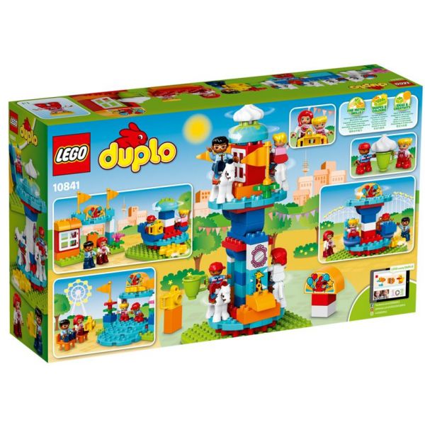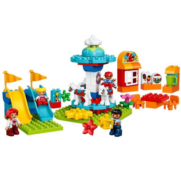 Ajuta-ti copilasul sa construiasca emblematicul carusel de basm, jucand scene dintr-o zi distractiva in familie. Copilasii vor adora sa roteasca varful caruselului pentru a privi cum se invart cei patru cai. Distreaza-te jucandu-te pe roluri, si spunand povesti in timp ce ei dau drumul figurinelor LEGO DUPLO pe tobogane, sau se indreapta catre standul de bilete. Include patru figurine DUPLO.
