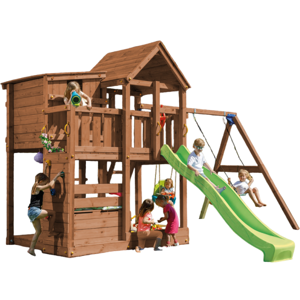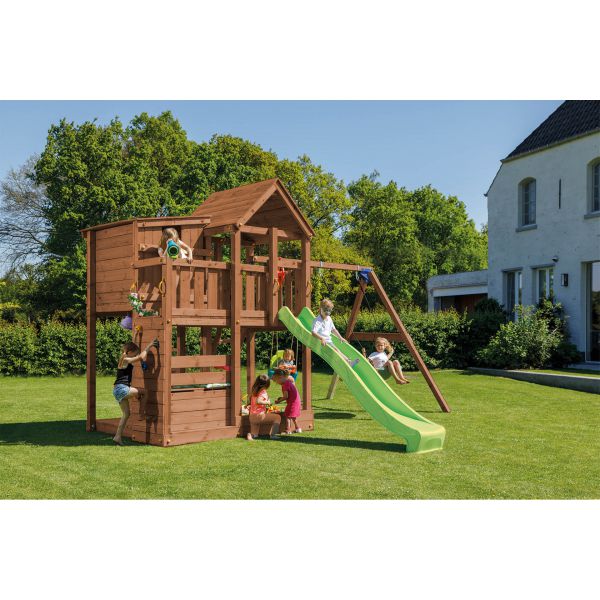 Palatzo cu leagane BlueRabbit 2.0 combina multiple forme de joaca transformand curtea in cel mai indragit loc de joaca. Spatiul de joaca este ideal pentru 5-6 copii in acelasi timp.