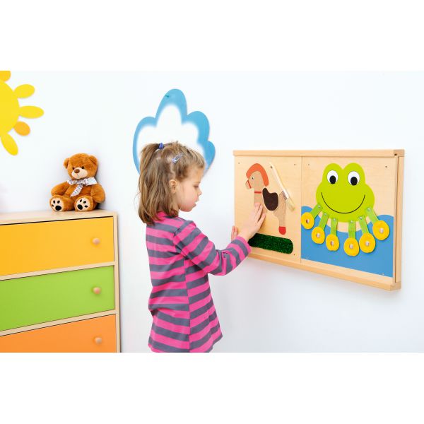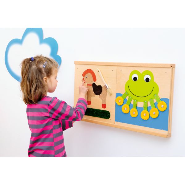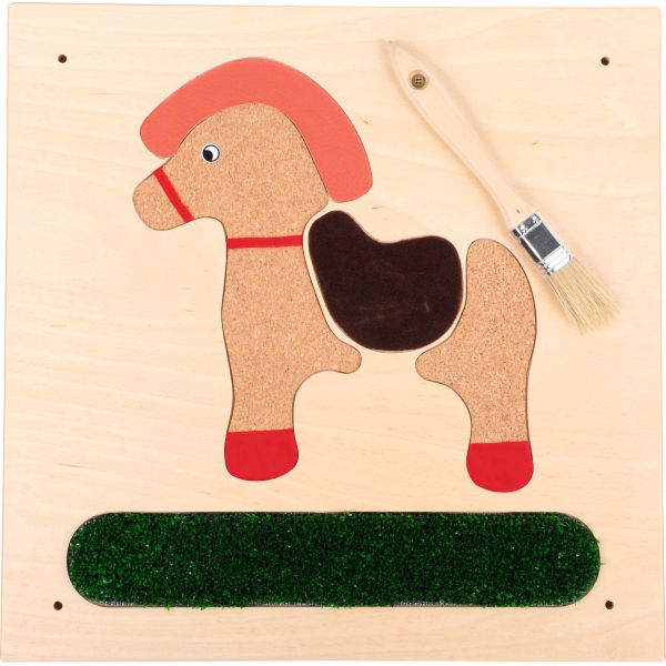 - Panoul cu cal permite copiilor să învețe diferite texturi: perie, covor de baie, iarbă artificială.