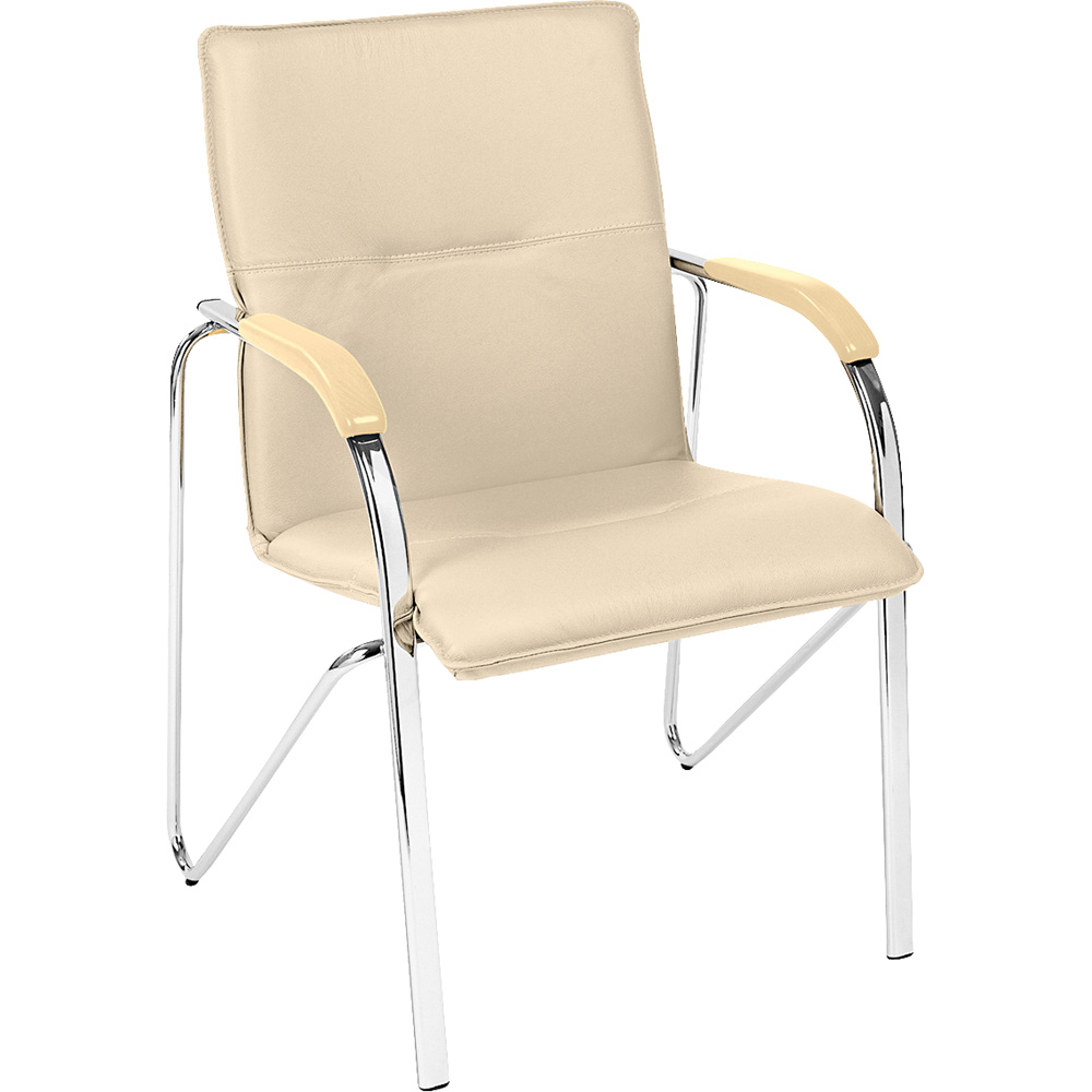 Scaun tapitat cu picioare din aluminiu, cotiere, stivuibil, bej