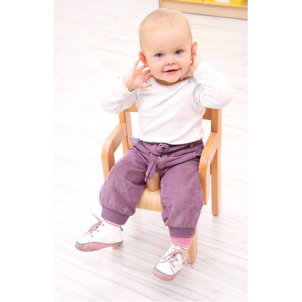 Scaun din fag lacuit pentru cresa, masura 0, cu opritor, cotiere si talpici din plastic
