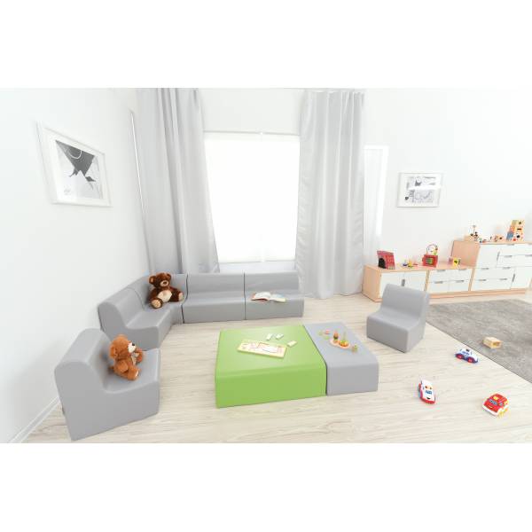 Masa verde din spuma, acoperita cu PVC rezistent si lavabil, fara ftalati.