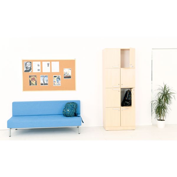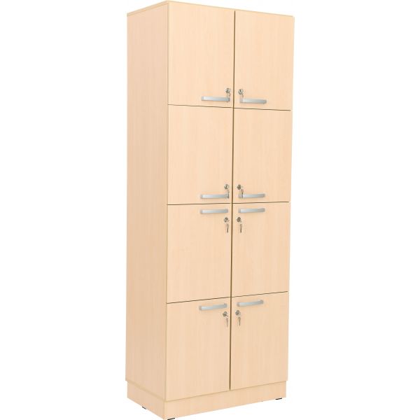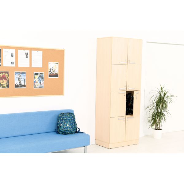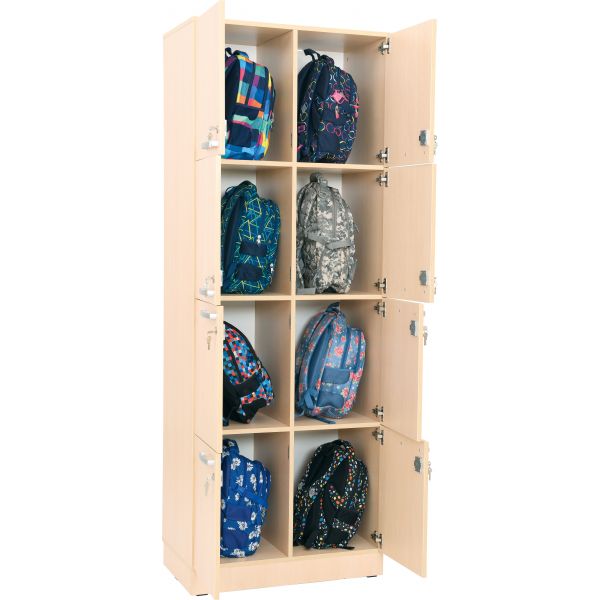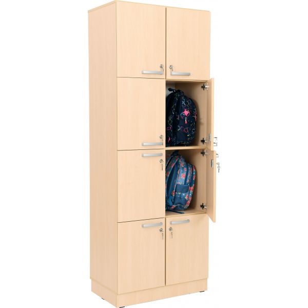 Dulap spațios pentru elevii de la școală, ideal pentru rucsacuri și ghiozdane, pentru depozitarea manualelor. Dulap din placă laminată arțar, grosime. 18 mm. Are 8 compartimente dotate cu o usa cu balamale la 90 de grade cu inchidere usoara, incuiabil.