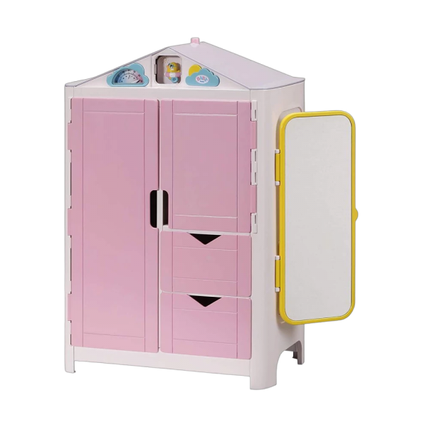 Dulapul alb are doua sertare, o usa mare si una mica cu ornamente roz. Poate fi decorat in continuare cu autocolante colorate. Exista o oglinda rabatabila pe lateral, cu un compartiment secret ascuns in spatele ei. Puteti gasi cheia secreta in forma de rata?r