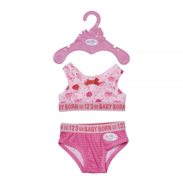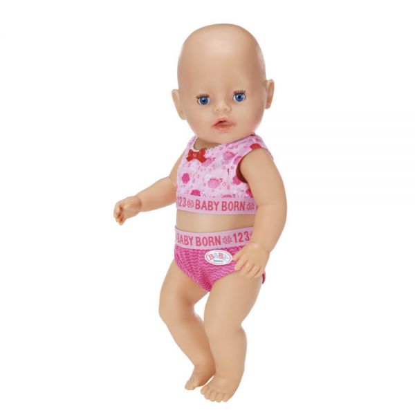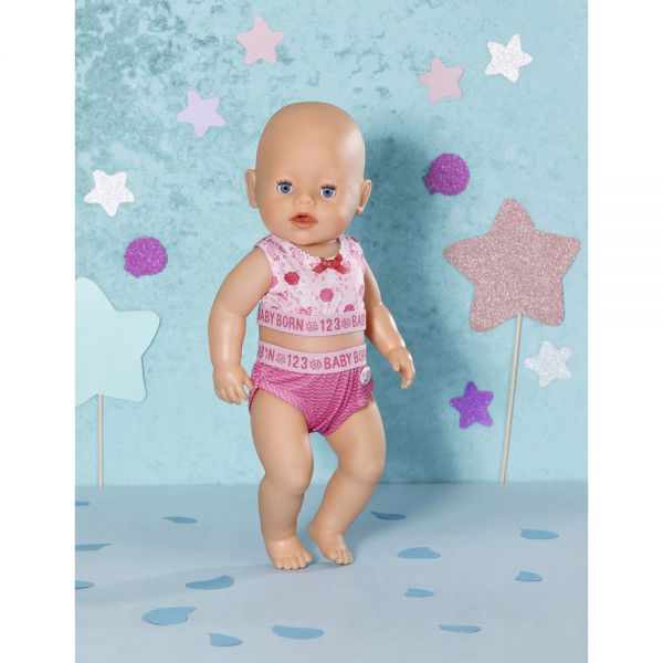 BABY born este foarte fericita in noua ei BABY born - Lenjerie de corp 43 cm diverse modele de la Zapf Creation. Acesta este modul ei de a spune ca se simte foarte confortabil. Poate ca are ceva de-a face cu scoica imprimata pe topul ei roz. Chiloteii roz asortati au dungi in zig-zag care seamana putin cu valurile.