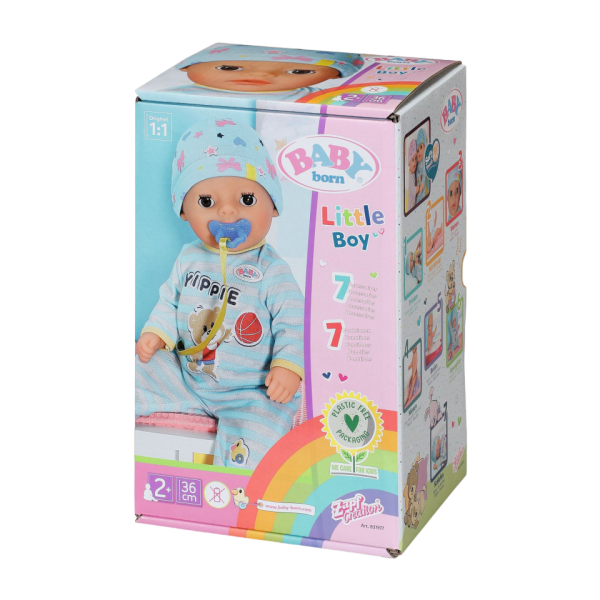 BABY born - Baiat este perfect pentru jocul de rol initial parinte-copil, incepand de la varsta de 2 ani. Cei 36 cm il fac sa aiba dimensiunea ideala pentru micii parinti ai papusilor, incepand de la varsta de 2 ani. Vine cu 7 accesorii pentru cele 7 functii.