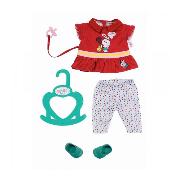 BABY born - Hainute sport rosii 36 cm de la Zapf Creation cu camasa, pantaloni si pantofi. Include suzeta si umeras pentru haine. Varsta recomandata 2 ani+.