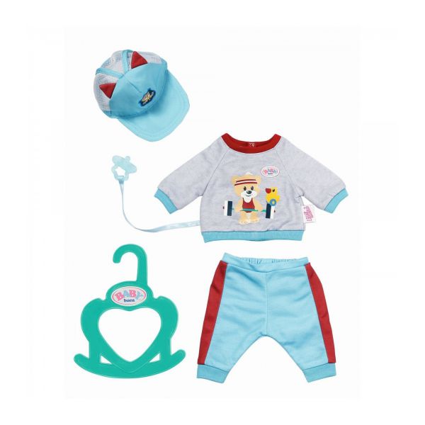 BABY born - Hainute sport albastre 36 cm de la Zapf Creation cu camasa, pantaloni si palarie. Include suzeta si umeras pentru haine. Varsta recomandata 2 ani+.
