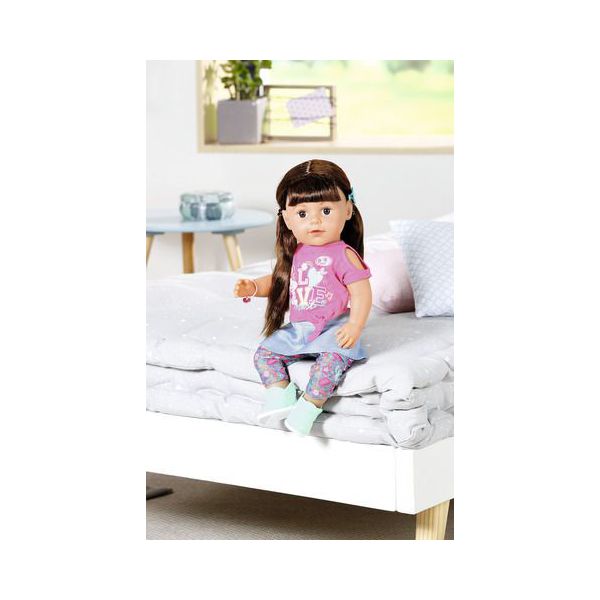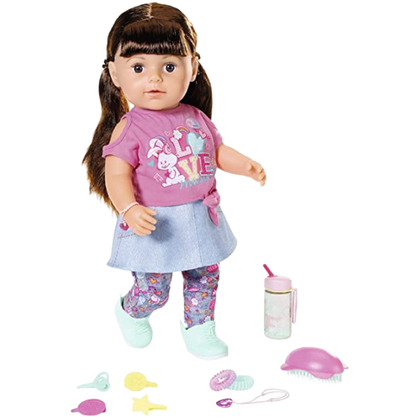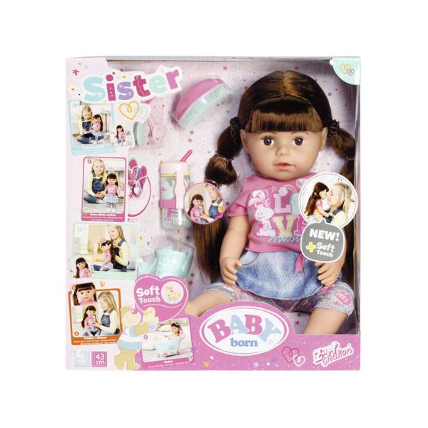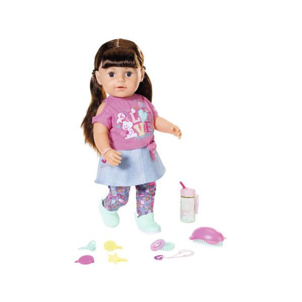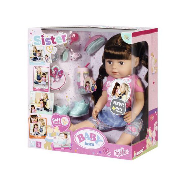 BABY born-Surioara interactiva satena de la Zapf Creation poarta o costumatie super la moda si este cea mai buna prietena cu care sa te distrezi si sa-ti impartasesti momentele. Pentru ca este de aceeasi marime cu surorile ei, acestea isi pot imprumuta hainutele si sa-si schimbe tinutele si accesoriile intre ele. Doar de pantalonasii ei cu floricele nu o sa vrea sa se desparta. Papusa are un corp moale, iar genunchii ii se indoaie oferind posibilitatea sa stea in fund sau in picioare. Oops se pare ca a cazut si a inceput sa planga. Dupa ce s-a linistit, ii va face placere sa-i aranjezi parul, ca apoi sa mergeti vesele la piscina, deoarece inotul este una dintre activitatile ei favorite. Jocurile variate cu BABY born surioara interactiva satena stimuleaza imaginatia si s-a dovedit ca sprijina dezvoltarea abilitatilor si valorilor sociale, cum ar fi responsabilitatea, comunicarea si empatia.