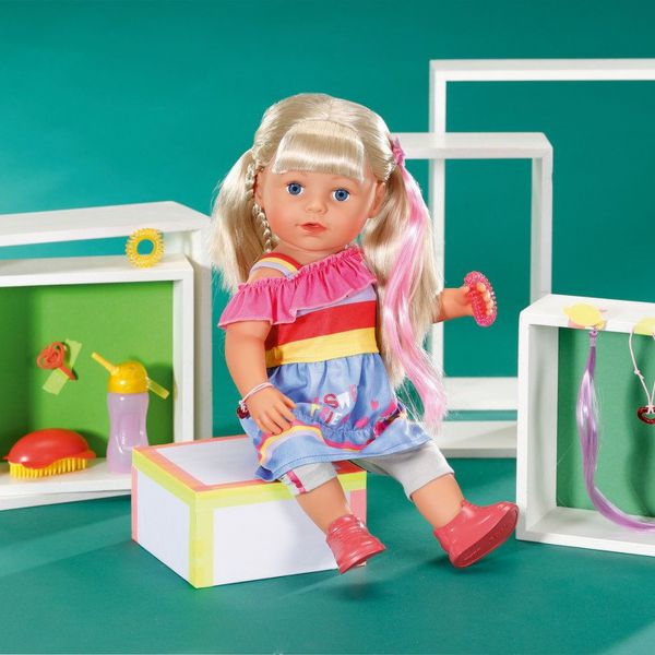 BABY born - Surioasa blonda iubeste coafura. In fiecare zi, ea vine cu noi stiluri pentru parul ei de inalta calitate. Impletiturile sunt decorate cu diverse accesorii pentru par. Clemele, elasticele pentru par si firele colorate de par se potrivesc perfect cu culorile tinutei sale. Ei ii plac in special firele de par roz si violet si vrea intotdeauna sa le scoata din parul surorii sale.