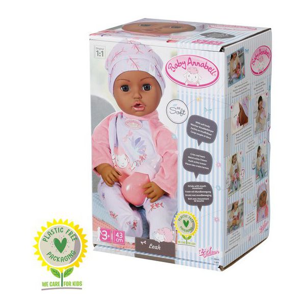 Cu functiile sale realiste , Baby Leah insoteste mamicile si taticii papusilor pe tot parcursul zilei. Papusa cu corp moale poate bea apa si scoate aerul dupa aceea. „Buurp!” O, draga, s-a auzit atat de tare incat au tresarit toate libelulele de pe lac. Iubeste micile creaturi, motiv pentru care sunt imprimate si pe salopeta ei. Micuta papusa este atat de trista ca au fugit incat plange si ii curg lacrimile. Suzeta o ajuta sa se calmeze. Face miscari realiste ale gurii atunci cand suge din suzeta si biberon. Odata ce totul revine la normal, o leganam pe genunchi si o gadilam, iar dupa un cascat lung si respiratii adanci, ea adoarme exact ca un bebelus real. Cand asezati papusa pe spate, ea isi inchide ochii.