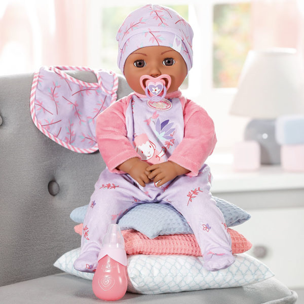 Baby Annabell - Papusica neagra Leah 43 cm de la Zapf Creation, cu salopeta si palarie. Inclusiv baveta, biberon, suzeta si lant. Varsta recomandata 3 ani+.