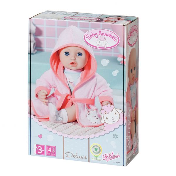 Baby Annabell isi face baia de frumusete. Ii place sa faca baie in cada ei magica. De aceea are un halat de baie dragut cu gluga. Sub halat, papusa curata poarta o salopeta scurta. Oita norisor de pe salopeta face un dus curcubeu.r