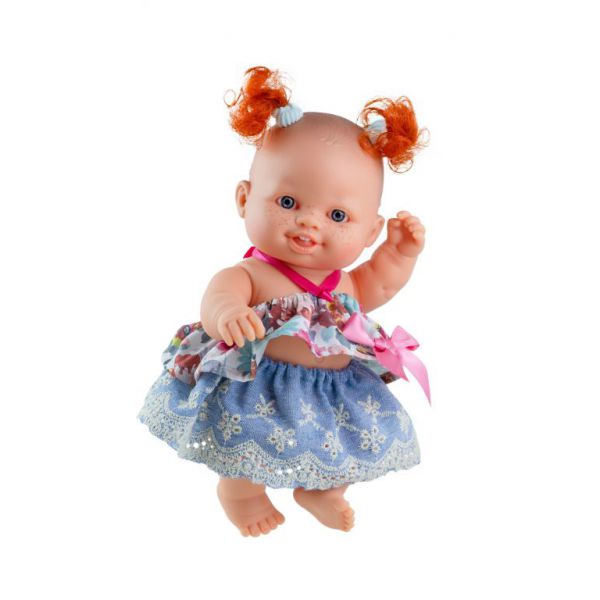 Petra, bebelusa pistruiata cu ochi albastri si codite roscate e foarte incantata de noua ei fustita bleu cu broderie alba si de topul evazat multicolor, prins cu bretele ciclamen la spate. \nPapusa este ambalata in punga transparenta, are ochi ficsi si cinci articulatii mobile.