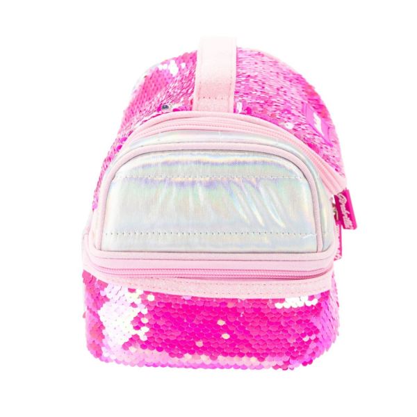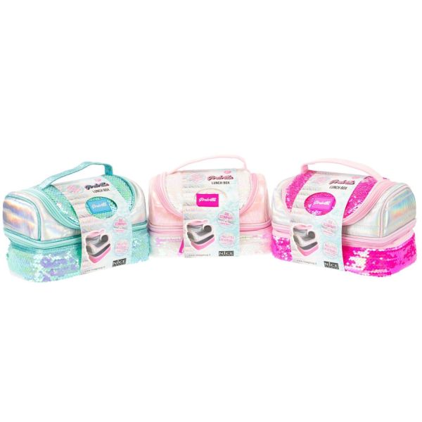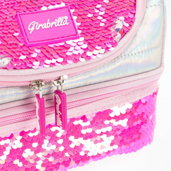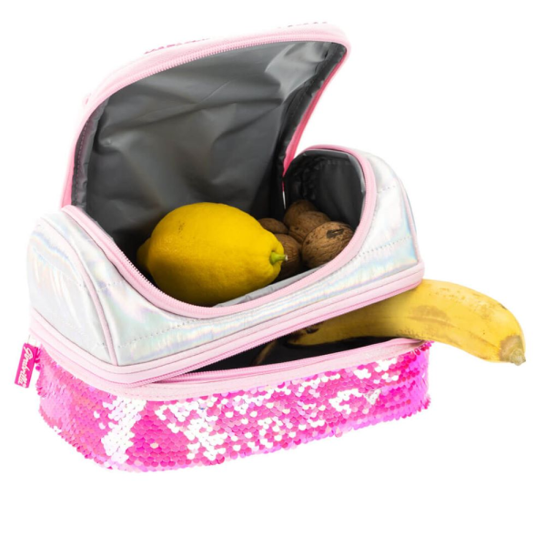 Lunchbox termoizolant decorat cu paiete reversibile. Are doua compartimente cu fermoar si interior rezistent la umezeala. Ideal pentru scoala, picnic sau gradinita.