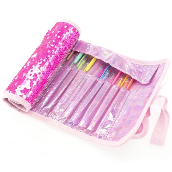 Penar decorat cu paiete si material iridescent. Include 12 pixuri gel si 6 markere duble. Se ruleaza si se prinde cu panglica glitter. Perfect pentru activitati creative si scoala. Recomandat 6+.