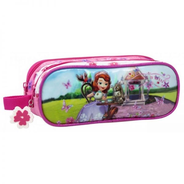 Penar Disney Printesa Sofia, cu 2 compartimente, imprimeu personaj Sofia, confectionat din satin si PVC.