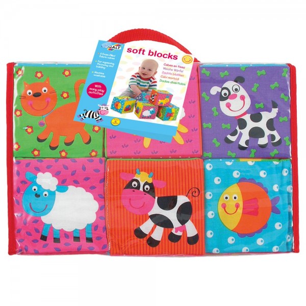 Sase cuburi mari cu imagini cu animalute care cu siguranta ii vor capta atentia micutului tau. Moi si foarte usoare, cuburile sunt ideale pentru dezvoltarea coordonatii ochi-mana si a dexteritatii. Copilasul le poate arunca, strange cu manutele sau poate construi cu ele. Cand jocul mai avanseaza, cel mic va putea sa potriveasca cele 12 perechi de animale, sa numere de la 1 la 6 si sa puna alaturi cuburile pentru a crea o poteca pe care merg animalutele. Lavabile la masina. Vin ambalate intr-o gentuta din PVC cu maner. Dimensiune cub: aprox. 10 cm Varsta recomandata: 6 luni +
