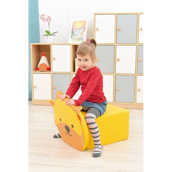 Puf moale cu design de animalut in culori vesele, realizat din spuma si acoperit cu vinil rezistent, usor de curatat.