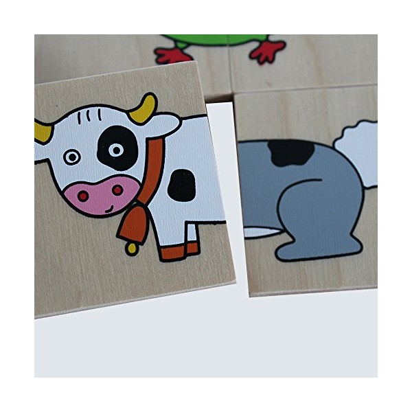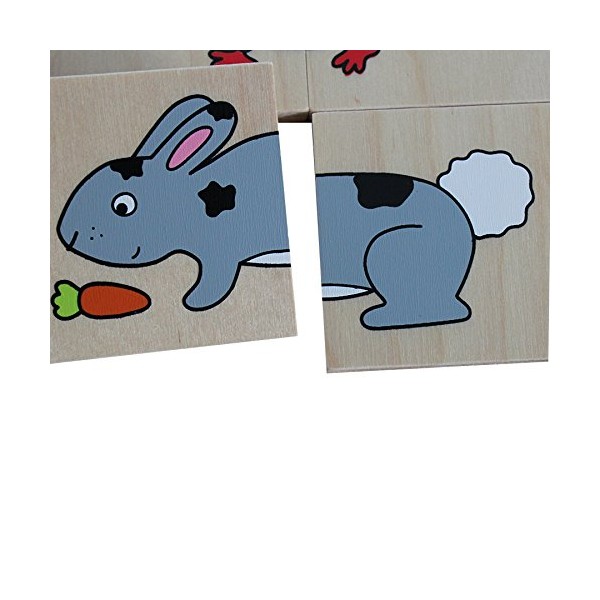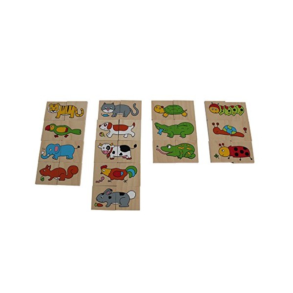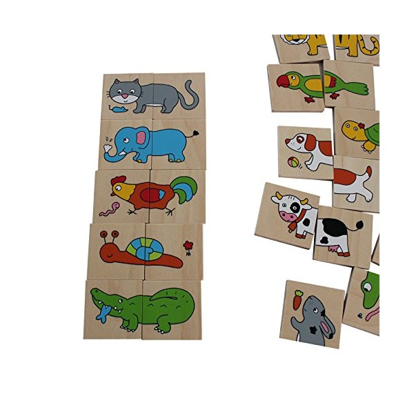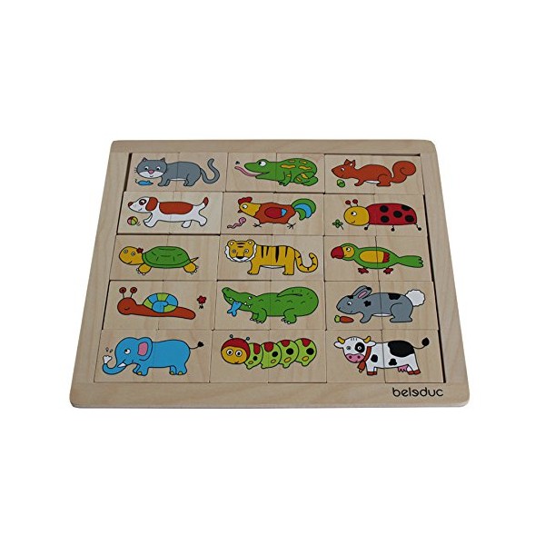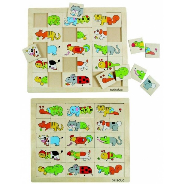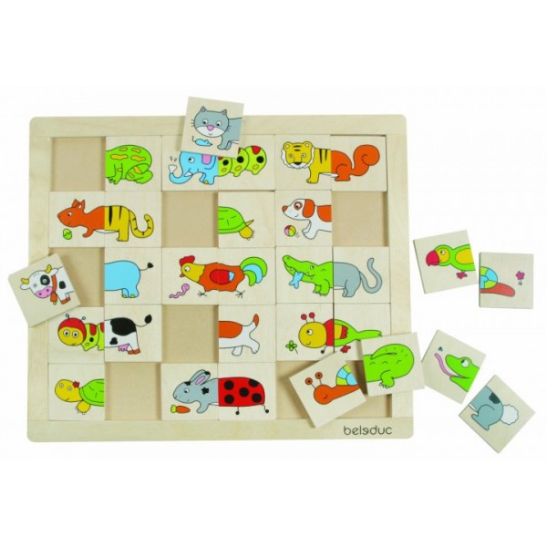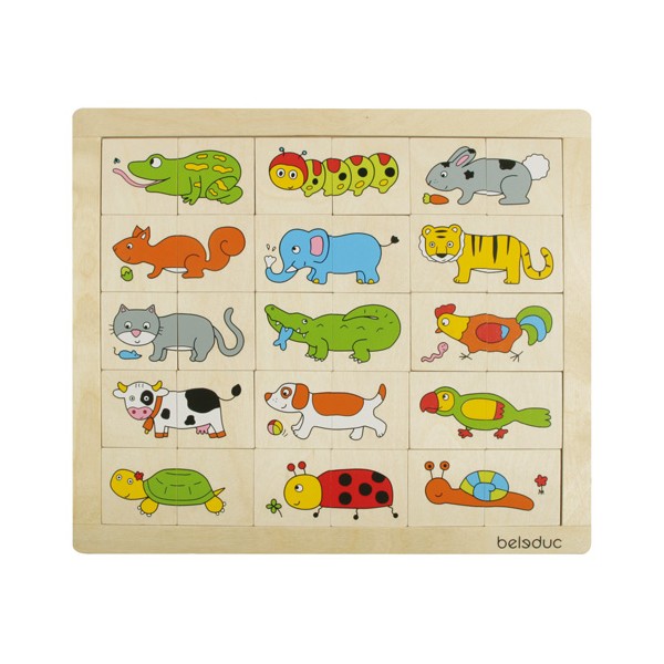 Puzzle din lemn compus din 30 de piese care se potrivesc doua cate doua formand animale salbatice, domestice si pasari. In total sunt 15 perechi.