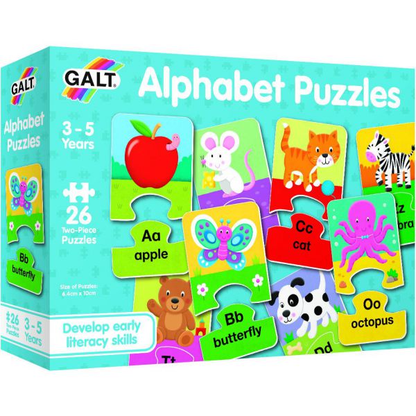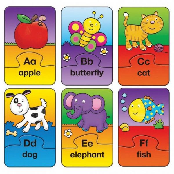 26 de puzzle-uri colorate, fiecare format din cate 2 piese, cu scopul de a incuraja recunoasterea literelor si abilitatile de potrivire. Fiecare puzzle contine intr-una din piese o imagine usor de recunoscut de copil, ce trebuie potrivita cu litera initiala si cuvantul din cea de-a doua piesa de puzzle. Doar piesele alese corect se vor potrivi. Dimensiune puzzle: 6.4 x 10 cm Varsta recomandata: 3- 5 ani.