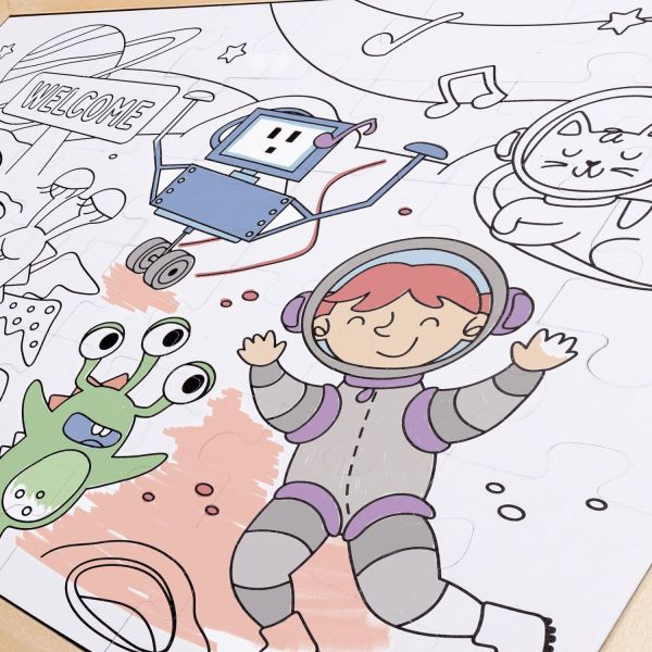 Puzzle din lemn 2 in 1 - Prietenii din Spatiu (50 piese), cu fata dubla si activitate colorare