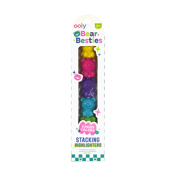 Adauga culoare si distractie notitelor tale cu evidentiatoarele stivuibile Bear Besties! 5 culori neon intense, varf tip dalta pentru evidentiere si subliniere, design compact si ursuleti adorabili. Perfecte pentru scoala, acasa sau cadou!