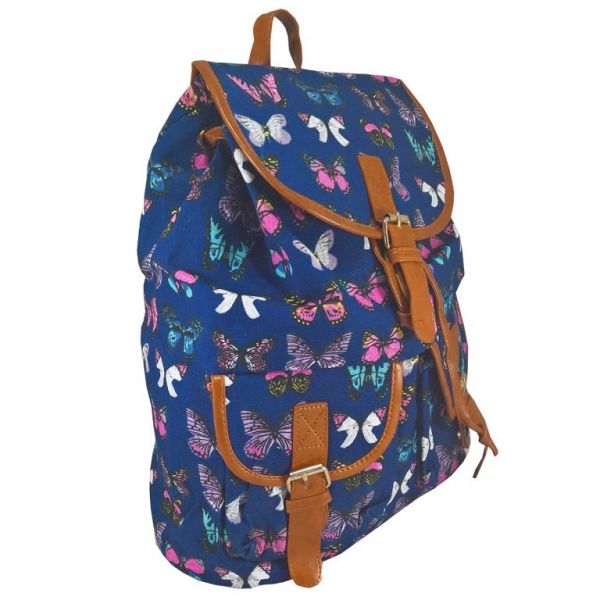 Rucsac urban din material textil cu imprimeu fluturi multicolori pe fond albastru inchis. La spate are doua curele reglabile. Are 1 compartiment interior, din poliester, prevazut pe lateral cu 1 buzunar cu fermoar. Compartimentul interior (sac) se inchide cu un snur. Are doua buzunare exterioare prevazute cu capac, barete, borduri cu accesoriu catarama metalica si inchidere cu capsa magnetica. La partea superioara este prevazut cu un maner fix si cu un capac din acelasi material textil, prevazut cu o bareta cu accesoriu catarama metalica si inchidere cu capsa magnetica . Bretele, barete, borduri, curele, snur inchidere sac, maner, borduri - sunt din piele ecologica. Dimensiuni : 34 lung x 15 lat x 40 inalt