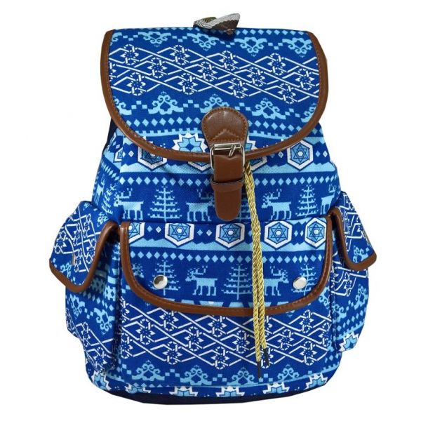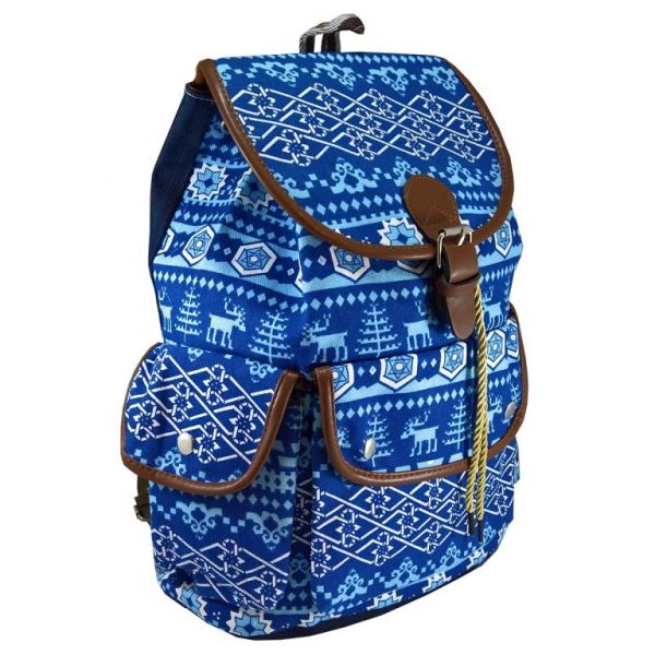 Rucsac urban din material textil cu imprimeu pe fond albastru, cu motive stilizate specifice sarbatorilor : reni, brazi, fulgi, retele decorative. La spate are doua curele reglabile din material textil. Spatele si fundul sacului sunt din material tip denim albastru. Are 1 compartiment interior, din poliester, prevazut pe lateral cu 1 buzunar cu fermoar. Compartimentul interior se inchide cu un snur din sfoara impletita. Are 3 buzunare exterioare prevazute cu capac si inchidere cu capsa metalica. La partea superioara este prevazut cu un capac din acelasi material textil, prevazut cu o bareta cu accesoriu catarama metalica si inchidere cu capsa magnetica. Rucsacul are un maner fix din material textil. Bretele, barete, borduri din piele ecologica. Dimensiuni : 34 lung x 15 lat x 40 inalt