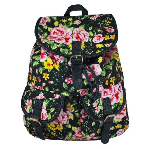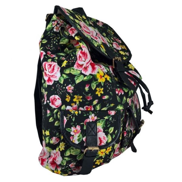 Rucsac urban din material textil cu imprimeu trandafiri roz pe fond negru. La spate are doua curele reglabile. Are 1 compartiment interior, din poliester, prevazut pe lateral cu 1 buzunar cu fermoar. Compartimentul interior (sac) se inchide cu un snur. Are doua buzunare exterioare prevazute cu capac, barete, borduri cu accesoriu catarama metalica si inchidere cu capsa magnetica. La partea superioara este prevazut cu un maner fix si cu un capac din acelasi material textil, prevazut cu o bareta cu accesoriu catarama metalica si inchidere cu capsa magnetica . Bretele, barete, borduri, curele, snur inchidere sac, maner, borduri - sunt din piele ecologica. Dimensiuni : 34 lung x 15 lat x 40 inalt