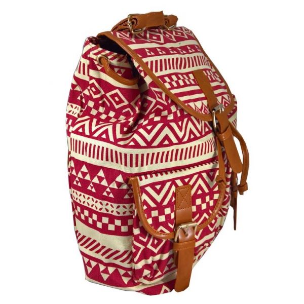 Rucsac urban din material textil cu motive grafice elementare roz inchis. La spate are doua curele reglabile si un buzunar secret. Are 1 compartiment interior, din poliester, prevazut pe lateral cu 1 buzunar cu fermoar. Compartimentul interior (sac) se inchide cu un snur. Are doua buzunare exterioare prevazute cu capac, barete, borduri cu accesoriu catarama metalica si inchidere cu capsa magnetica. La partea superioara este prevazut cu un maner fix si cu un capac din acelasi material textil, prevazut cu o bareta cu accesoriu catarama metalica si inchidere cu capsa magnetica . Bretele, barete, borduri, curele, snur inchidere sac, maner, borduri - sunt din piele ecologica. Dimensiuni : 34 lung x 15 lat x 34 inalt