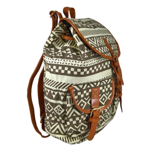 Rucsac urban din material textil cu motive grafice elementare maro. La spate are doua curele reglabile si un buzunar secret. Are 1 compartiment interior, din poliester, prevazut pe lateral cu 1 buzunar cu fermoar. Compartimentul interior (sac) se inchide cu un snur. Are doua buzunare exterioare prevazute cu capac, barete, borduri cu accesoriu catarama metalica si inchidere cu capsa magnetica. La partea superioara este prevazut cu un maner fix si cu un capac din acelasi material textil, prevazut cu o bareta cu accesoriu catarama metalica si inchidere cu capsa magnetica . Bretele, barete, borduri, curele, snur inchidere sac, maner, borduri - sunt din piele ecologica. Dimensiuni : 34 lung x 15 lat x 34 inalt