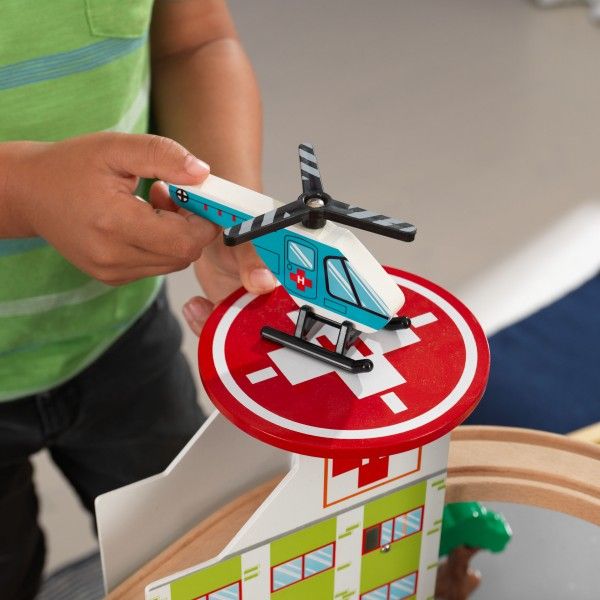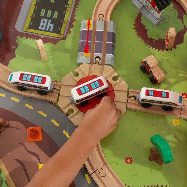 Cu mai mult de 80 de piese, copiii isi pot crea propriile povesti in acest oras aglomerat. Trenul de pasageri cu trei autovehicule calatoreste in aer, trecand prin zgarie-nori si peste un munte cu un tunel intunecat care trece prin el. O punte de trecere trece peste pista si la statia aeroportului, cu un brat care se ridica pentru a permite trecerea trenului, pe masura ce orasele zambitoare si ilustratiile stralucitoare aduc la viata aceasta masa de tren. Suprafata de joc ofera spatiu mare de joaca pentru copii, cu un buzunar ce permite pastrarea jucariilor de pe masa si de pe podea.
