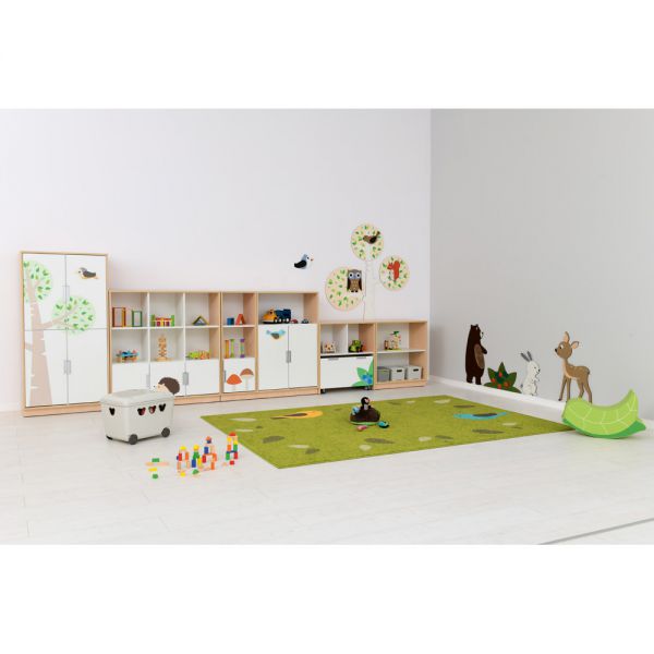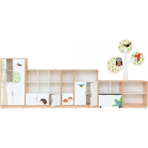 Dulapuri cu fronturi albe și aplicații referitoare la teme forestiere: copac, păsări, ciuperci, arici.