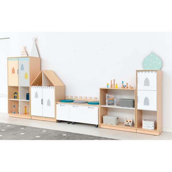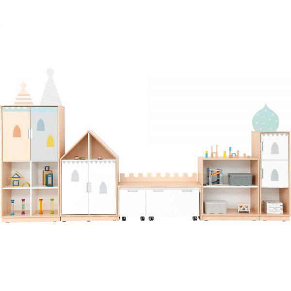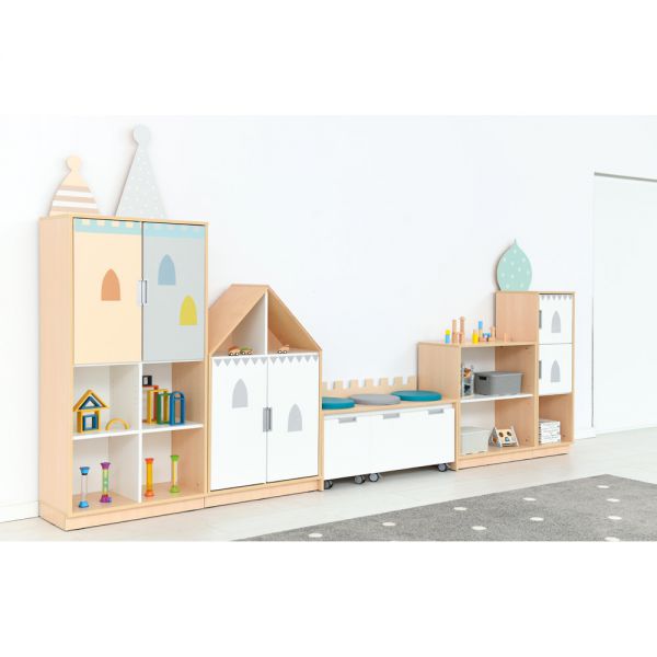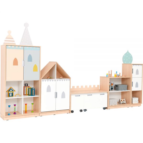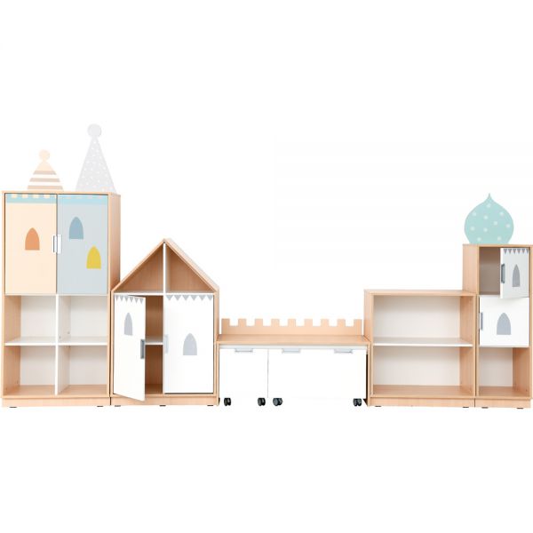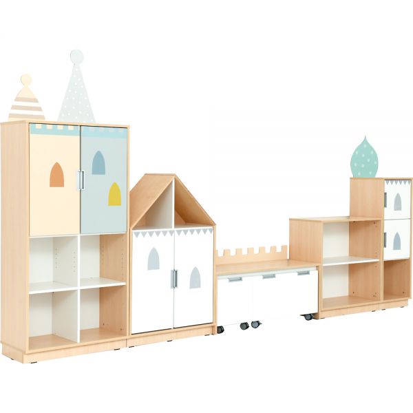 Dulapuri cu fronturi albe și aplicații care se referă la tema unui palat de basm: turnuri, ferestre mici.