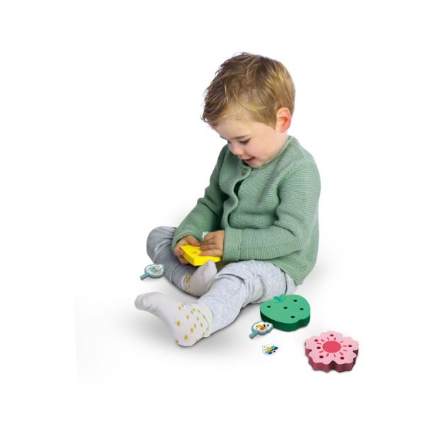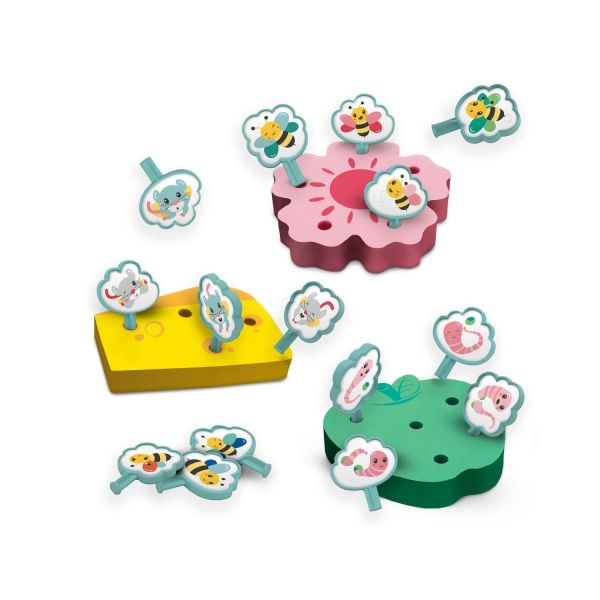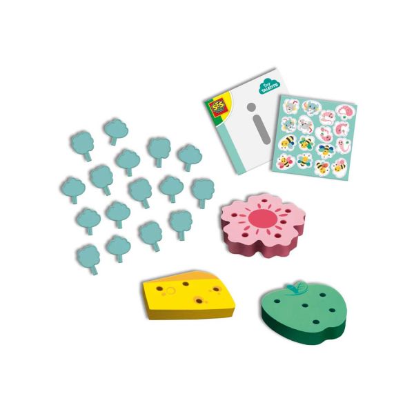 Contine: 16 ace din plastic; mar cu gauri, spuma verde; floare cu gauri, spuma roz; branza cu gauri, spuma galbena; 16 autocolante; instructiuni.