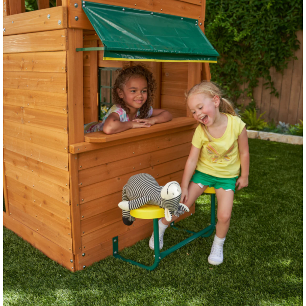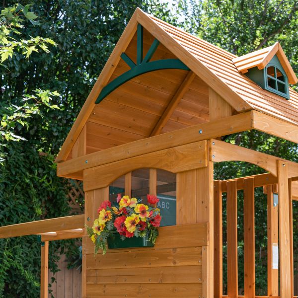 Structura este realizata din lemn premium 100%, tratat cu finisaj sigur pentru copii si conceput pentru rezistenta la utilizare intensiva in exterior. Detaliile decorative precum ferestrele tip dormer, acoperisul shiplap si cutia pentru flori adauga un aspect elegant si prietenos gradinii.