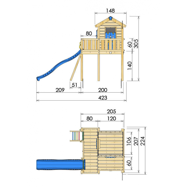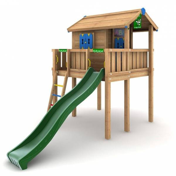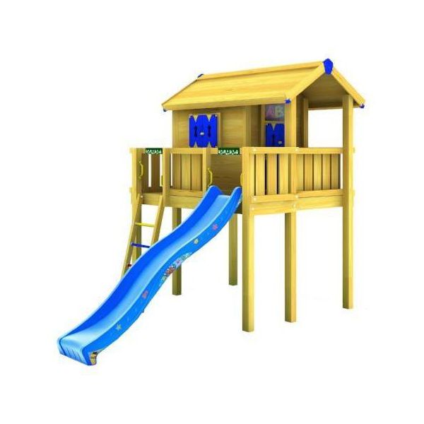 Acest model contine Playhouse-ul, care se monteaza pe partea de sus a unei platforme de 1.45m, cu o veranda mare si un diapozitiv de 3 m