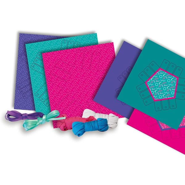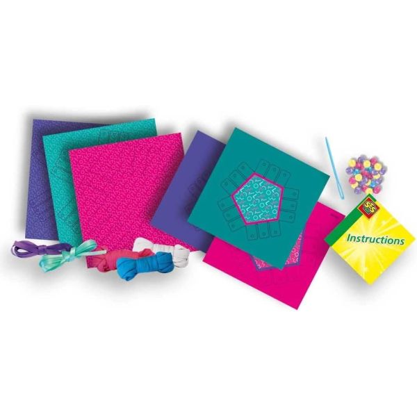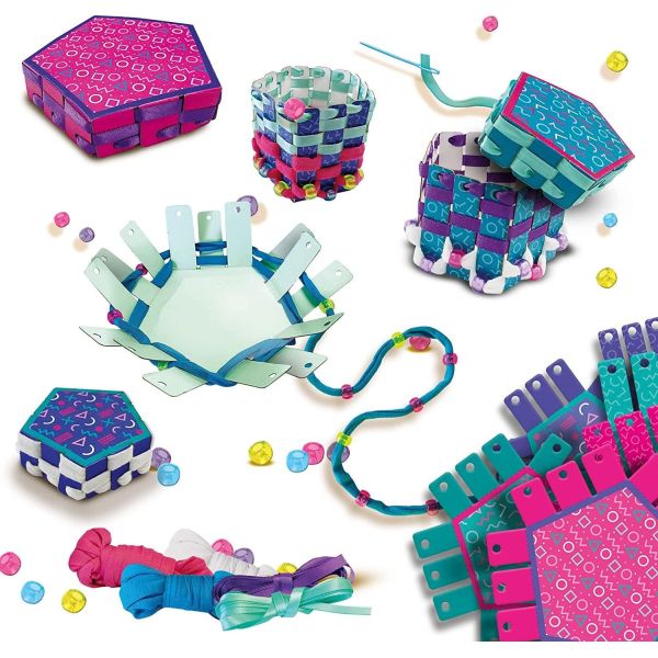Invatati cu usurinta cum sa teseti cosuri cu acest set de tesut. Folositi cosurile de hartie ca baza si impletiti cele mai frumoase cosuri folosind acul de plastic sigur si firele de tricouri in trei culori. Lasati-va creativitatea sa scape si decorati cosurile cu margele de ponei si cele doua culori de panglica de satin. In set sunt suficiente materiale pentru trei cosuri cu capace.