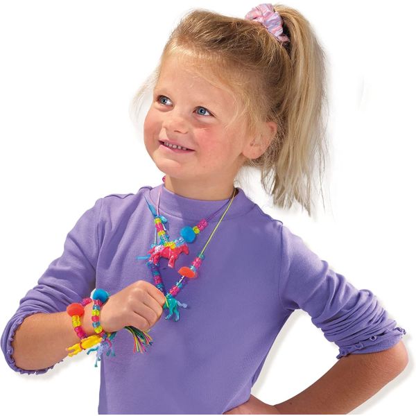 Cu acest set de bijuterii cu pompon caluti, iti poti realiza propriile bijuterii cu pandantive de caluti. Foloseste firul colorat, margelele ponei, panglica si pompoanele pentru a realiza bijuterii frumoase precum bratari sau coliere.