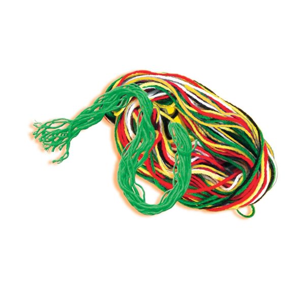 Contine: 4 carduri de broderie preimprimate (perforate); ac; degetar; ata: negru, rosu, albastru, galben, verde.