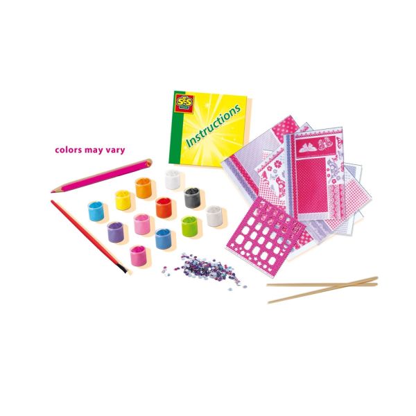 Contine: 10 x unghii; pietre pretioase asortate; 12 x vopseluri; 1 x pensula de acuarele; tipsuri asortate.