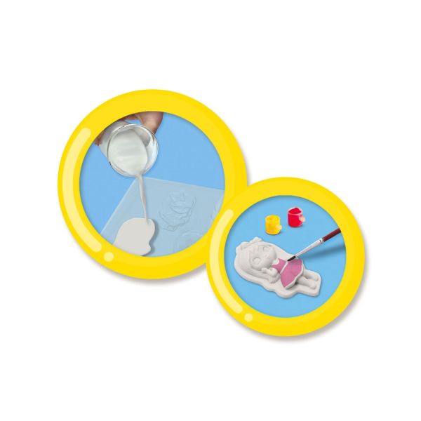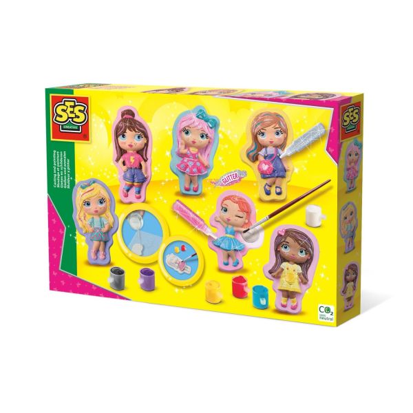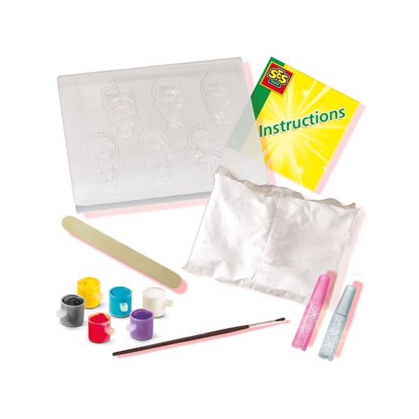 Contine: sabloane pentru fete de moda; praf de ipsos (300gr); spatula; 6 culori de acuarela (6x5 ml); pensula; adeziv cu sclipici argintiu; lipici roz cu sclipici; instructiuni.