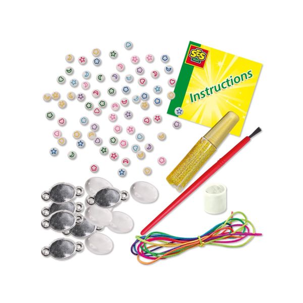 Contine: amestec de margele care straluceste in intuneric; 6 brelocuri de culoare argintie; 6 bile acrilice pentru pandantive; lipici (5ml); fir elastic curcubeu; pensula; adeziv cu sclipici auriu (5ml); instructiuni.