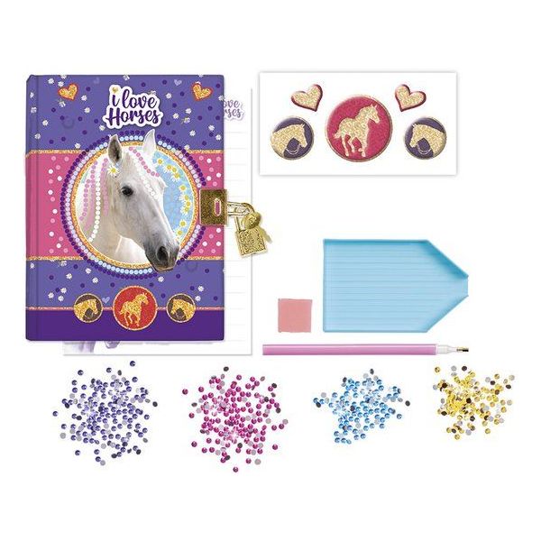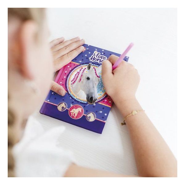 Un jurnal creativ pentru copiii pasionați de cai și activități DIY. Coperta decorată prin tehnica Diamond Painting face din acest set un proiect artistic atrăgător și un spațiu ideal pentru gânduri, desene și povestiri.
