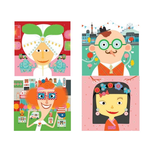 Setul conține: 16 de planșe de decorat, ilustrate cu portrete, 6 planșe cu abțibilduri individuale, cărticică cu instrucțiuni. Confecționat din materiale și vopsele non-toxice.